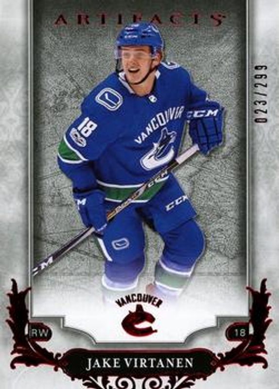 Jake Virtanen's Hockey cards are available in at least 44 sets. Jake Virtanen's biggest 7-day price movers are 2015 SP Authentic #277 Future Watch Auto /999, 2015 Upper Deck #457 Young Guns - UD Exclusives /100, and 2015 Upper Deck #457 Young Guns - UD High Gloss /10.
