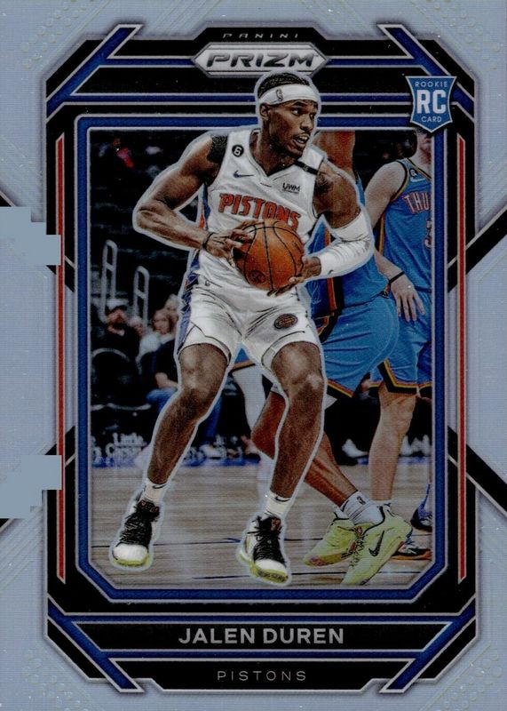 Jalen Duren's Basketball cards are available in at least 67 sets. Jalen Duren's biggest 7-day price movers are 2022 Donruss #213 Choice, 2022 Court Kings #83 Rookies I, and 2022 Prizm #239 Pink Ice.