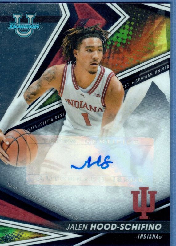 Jalen Hood-Schifino's Basketball cards are available in at least 35 sets. Jalen Hood-Schifino's biggest 7-day price movers are 2023 Hoops #14 Presentations /(SSP), 2022 Bowman Best University #BOA-JHS Best of 2022 Autographs, and 2023 Impeccable #31 International.