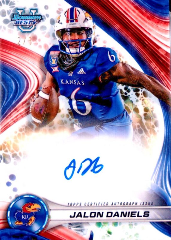 Jalon Daniels' Football cards are available in at least 11 sets. Jalon Daniels' biggest 7-day price movers are 2024 Bowman Best University #BOA-JDA Best of 2024 Autographs - White Refractor /5, 2024 Prizm Draft Picks #200 Autographs, and 2024 Bowman Best University #BOA-JDA Best of 2024 Autographs - Black Geometric Refractor /1.