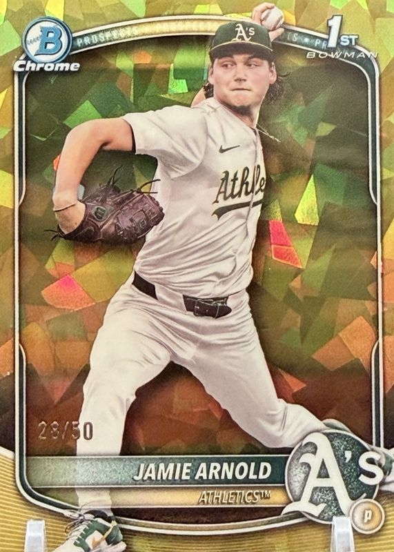 Jamie Arnold's Baseball cards are available in at least 11 sets. Jamie Arnold's biggest 7-day price movers are 2025 Bowman Draft #BDC-30 Chrome - Purple Refractor /250 (1st), 2025 Bowman Draft #BDC-30 Chrome (1st), and 2025 Bowman Draft Sapphire Edition #BDC-30 Chrome (1st).