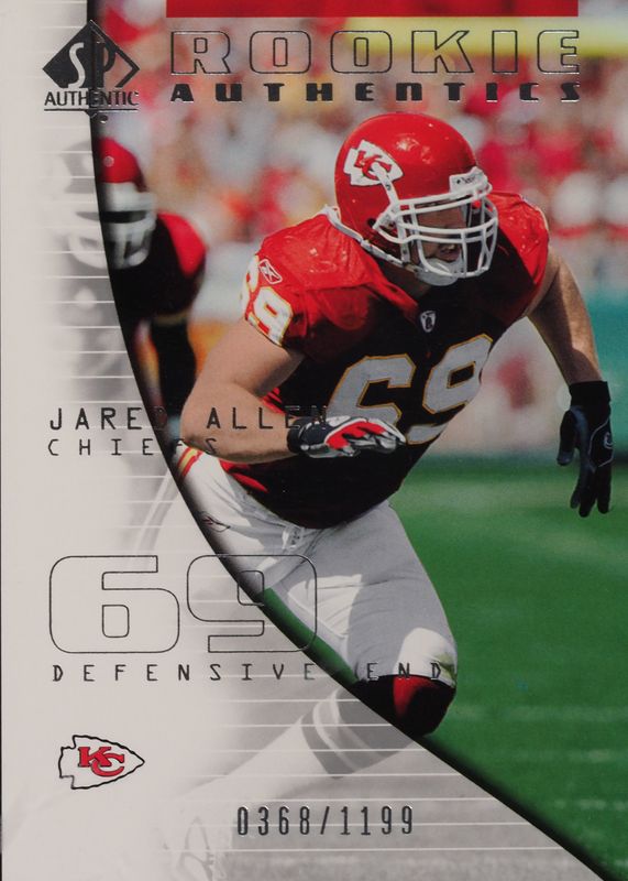 Jared Allen's Football cards are available in at least 48 sets. Jared Allen's biggest 7-day price movers are 2004 SP Authentic #101 Base /1199, 2014 Prizm #113 Purple, and 2014 Prizm #113 Red White Blue.