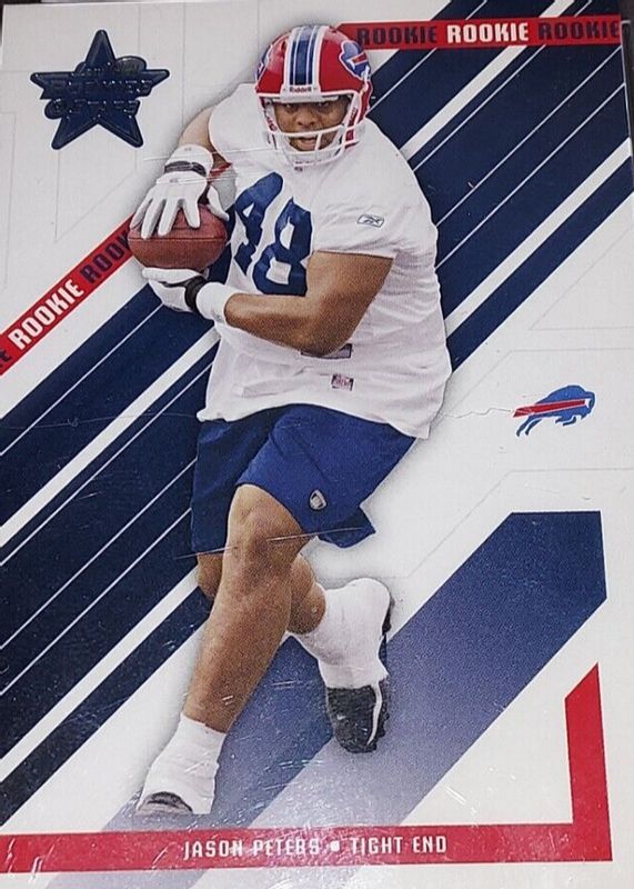 Jason Peters' Football cards are available in at least 17 sets. Jason Peters' biggest 7-day price movers are 2004 Leaf Rookies & Stars #108 Base, 2004 Bowman #232 1st Edition, and 2004 Bowman #232 Gold.