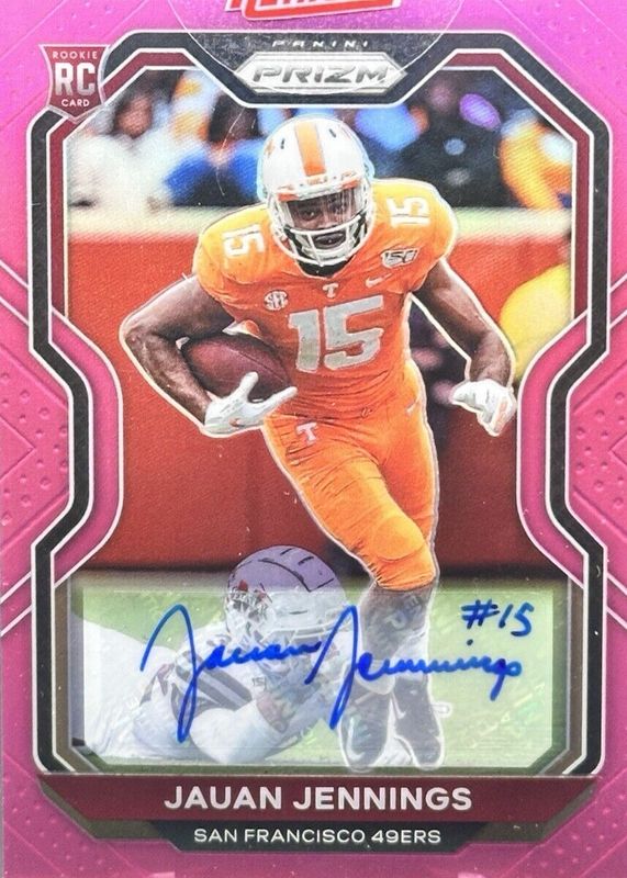 Jauan Jennings' Football cards are available in at least 7 sets. Jauan Jennings' biggest 7-day price movers are 2020 Prizm #304 Rookie Autographs - Pink, 2025 Prizm #258 Autographs - Black Shimmer /1, and 2025 Prizm #258 Autographs - Green Shimmer /5.