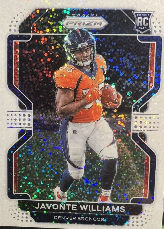 Javonte Williams' Football cards are available in at least 41 sets. Javonte Williams' biggest 7-day price movers are 2021 Prizm #345 White Sparkle /(SSP), 2022 Absolute #G-JAW Glass /(SSP), and 2021 One #43 Rookie Dual Patch Auto - Bronze (/49).