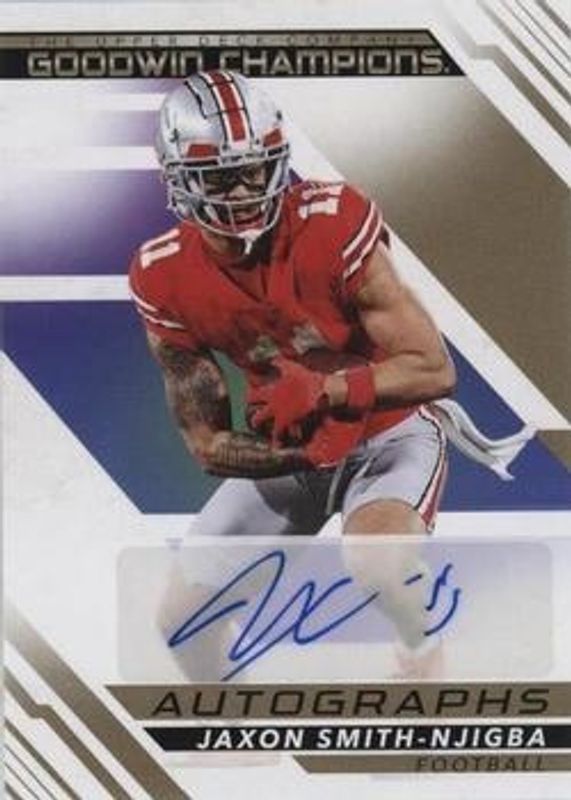 Jaxon Smith-Njigba's Multi-Sport cards are available in at least 8 sets. Jaxon Smith-Njigba's biggest 7-day price movers are 2022 Upper Deck Goodwin Champions #A-SN Autographs, 2022 Upper Deck Goodwin Champions #GA-SN Goudey Autographs, and 2022 Upper Deck Goodwin Champions #09T-JN Exquisite Collection 2009 Rookie Auto /49.