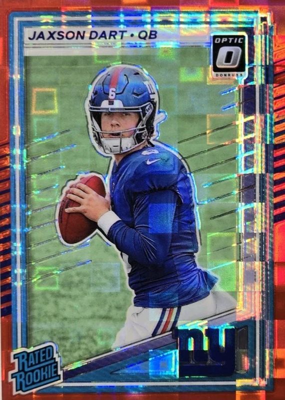 Jaxson Dart's Football cards are available in at least 34 sets. Jaxson Dart's biggest 7-day price movers are 2025 Mosaic #12 Storm - Silver, 2025 Donruss #400 Press Proof Red, and 2025 Rookies & Stars #6 Rookie Rush.