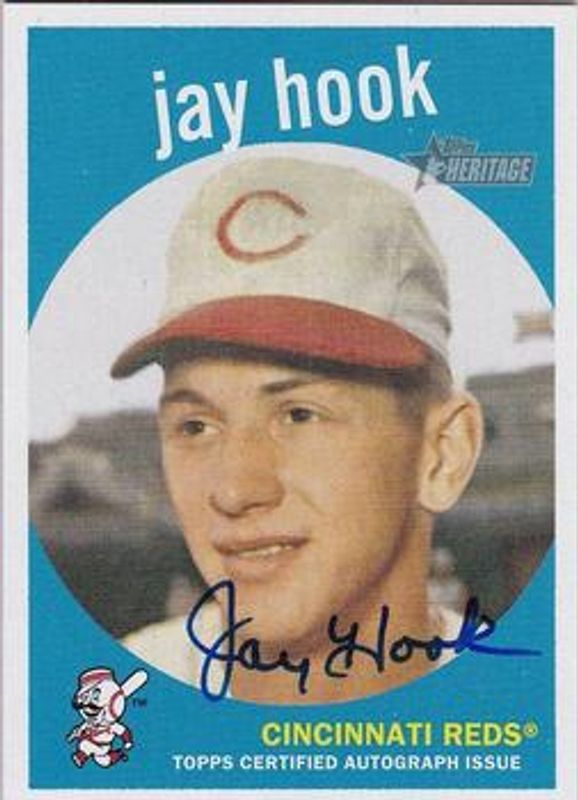Jay Hook's Baseball cards are available in at least 13 sets. Jay Hook's biggest 7-day price movers are 2008 Topps Heritage #ROA-JH Real One Autographs, 2008 Topps Heritage #ROA-JH Real One Autographs - Red Ink /59, and 2009 Topps Heritage #187 50th Anniversary Buybacks.