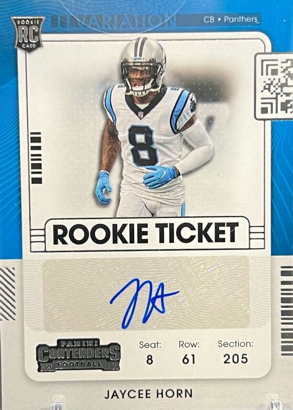 Jaycee Horn's Football cards are available in at least 12 sets. Jaycee Horn's biggest 7-day price movers are 2021 Contenders #144 Rookie Ticket Auto Variation, 2021 National Treasures #205 Rookie Patch Auto - Purple /49, and 2021 National Treasures #205 Rookie Patch Auto - Green Jersey Number (/8).