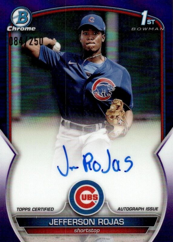 Jefferson Rojas' Baseball cards are available in at least 8 sets. Jefferson Rojas' biggest 7-day price movers are 2023 Bowman Sapphire Edition #BCP-70 Chrome Prospects (1st), 2023 Bowman #CPA-JR Chrome Prospect Auto - Purple Refractor /250 (1st), and 2023 Bowman #CPA-JR Chrome Prospect Auto - Yellow Refractor /75 (1st).