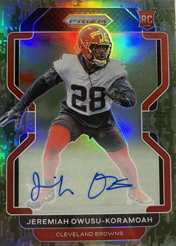 Jeremiah Owusu-Koramoah's Football cards are available in at least 5 sets. Jeremiah Owusu-Koramoah's biggest 7-day price movers are 2021 Prizm #389 Rookie Autographs - Camo /25, 2021 Prizm #389 Rookie Autographs - Blue Shimmer /25, and 2021 Prizm #389 Rookie Autographs - Gold Vinyl /5.