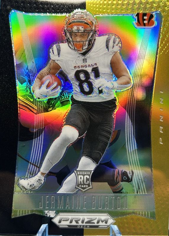 Jermaine Burton's Football cards are available in at least 25 sets. Jermaine Burton's biggest 7-day price movers are 2024 Prizm Deca #63 Black Gold /5, 2024 Wild Card Automania American Clearview and Painted Eagle #AMATA-JB Triangle Rainbow Fighter Jets Auto /1, and 2024 Wild Card Automania American Clearview and Painted Eagle #AMSQ-JB Square Rainbow Fireworks 1 /1.