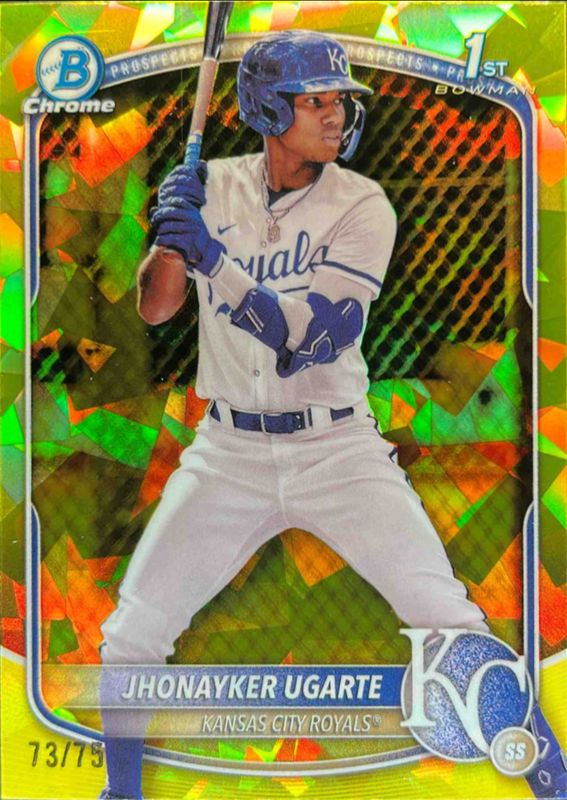 Jhonayker Ugarte's Baseball cards are available in at least 2 sets. Jhonayker Ugarte's biggest 7-day price movers are 2025 Bowman #CPA-JU Chrome Prospect Auto - Black Refractor /10 (1st), 2025 Bowman #CPA-JU Chrome Prospect Auto - Black X-Fractor /10 (1st), and 2025 Bowman #CPA-JU Chrome Prospect Auto - Blue Refractor /150 (1st).