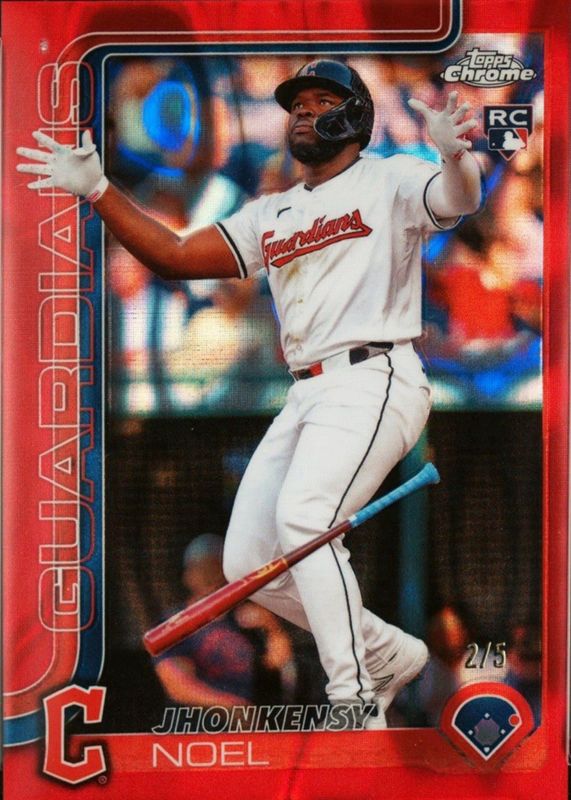 Jhonkensy Noel's Baseball cards are available in at least 19 sets. Jhonkensy Noel's biggest 7-day price movers are 2025 Topps Chrome #291 X-Fractor, 2025 Topps Chrome Logofractor Edition #RA-JN Rookie Autographs - Red Refractor /5, and 2025 Topps Update #RRR-JN Rising Rookie Relics - Gold /50.
