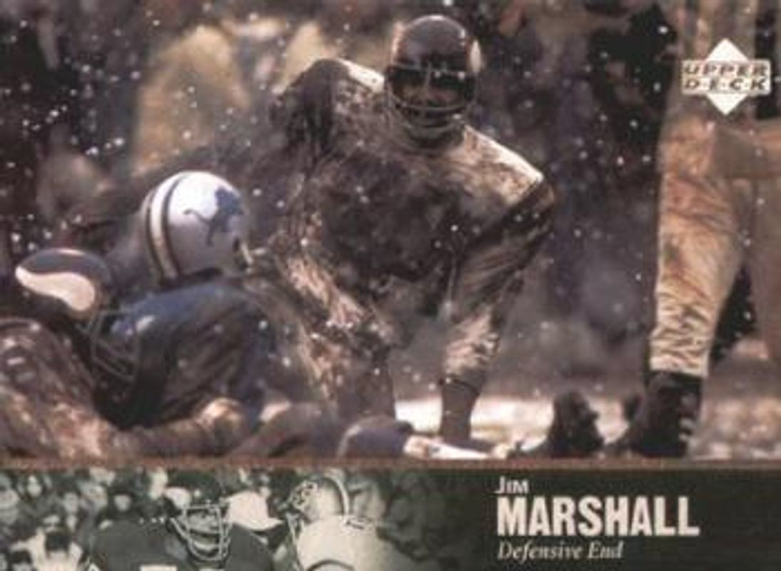 Jim Marshall's Football cards are available in at least 12 sets. Jim Marshall's biggest 7-day price movers are 1997 Upper Deck Legends #134 Base, 1997 Upper Deck Legends #AL-134 Autographs, and 1963 Topps #107 Base.