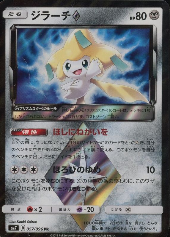 Jirachi Prism Star's Pokemon cards are available in at least 2 sets. Jirachi Prism Star's biggest 7-day price movers are 2018 Japanese Sun & Moon: Sky-Splitting Charisma #057/096 Holo, and 2018 Sun & Moon: Celestial Storm #097/168 Holo.