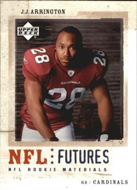 JJ Arrington's Football cards are available in at least 4 sets. JJ Arrington's biggest 7-day price movers are 2005 Upper Deck Rookie Materials #107 Base, 2005 Upper Deck Rookie Materials #ST-11 Stars of Tomorrow, and 2005 Upper Deck Rookie Materials #R14 Rookie Jerseys.