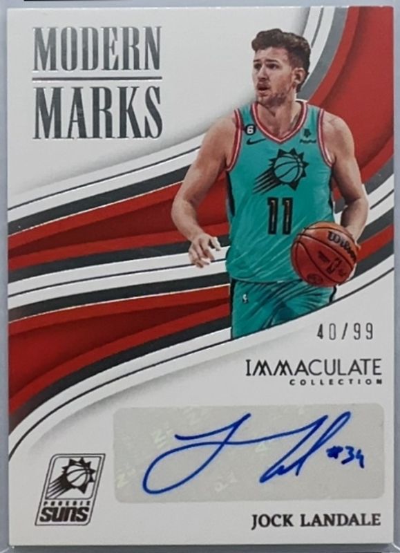 Jock Landale's Basketball cards are available in at least 7 sets. Jock Landale's biggest 7-day price movers are 2022 Immaculate #IMO-JLA Modern Marks /99, 2022 Immaculate #IMO-JLA Modern Marks - Gold /10, and 2022 Immaculate #IMO-JLA Modern Marks - Red /25.