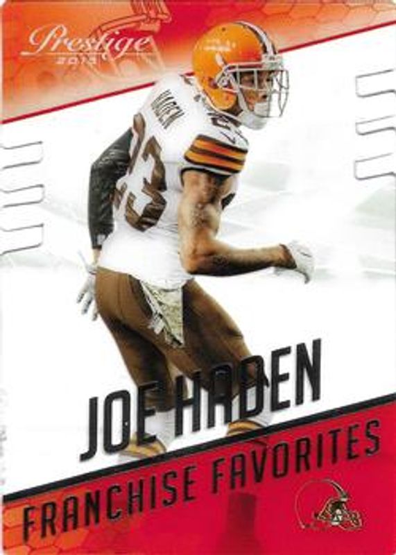 Joe Haden's Football cards are available in at least 65 sets. Joe Haden's biggest 7-day price movers are 2015 Prestige #30 Franchise Favorites, 2015 Prestige #FF-JH Franchise Favorites Materials /15, and 2015 Prestige #2 Franchise Favorites Materials - Prime /5.
