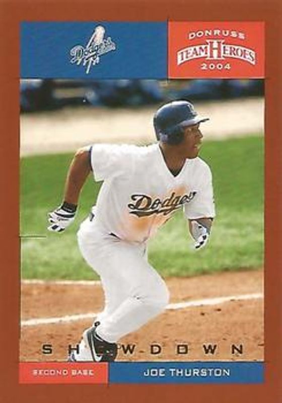 Joe Thurston's Baseball cards are available in at least 3 sets. Joe Thurston's biggest 7-day price movers are 2004 Donruss Team Heroes #213 Showdown - Bronze /150, 2004 Donruss Team Heroes #213 Base, and 2004 Donruss Team Heroes #213 Autographs /10.
