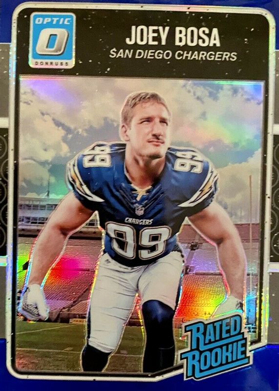Joey Bosa's Football cards are available in at least 91 sets. Joey Bosa's biggest 7-day price movers are 2016 Optic #175 Blue /149, 2016 Optic #175 Orange /199, and 2016 Optic #175 Red & Yellow.