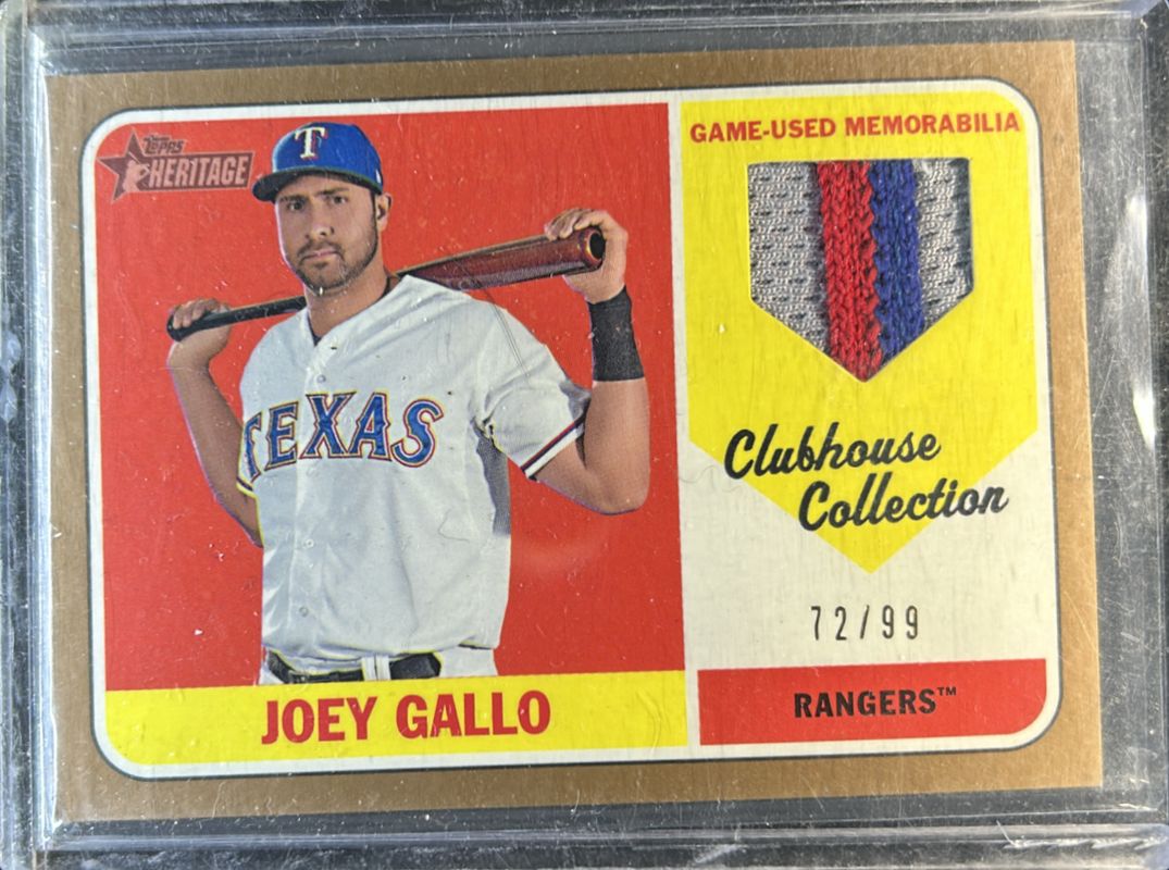 Joey Gallo's Baseball cards are available in at least 58 sets. Joey Gallo's biggest 7-day price movers are 2013 Topps Heritage Minor League #MP-JG Manufactured Commemorative Hat Logo Patches, 2013 Topps Heritage Minor League #62 Black /96, and 2013 Topps Heritage Minor League #RTTS-JG Road to the Show.