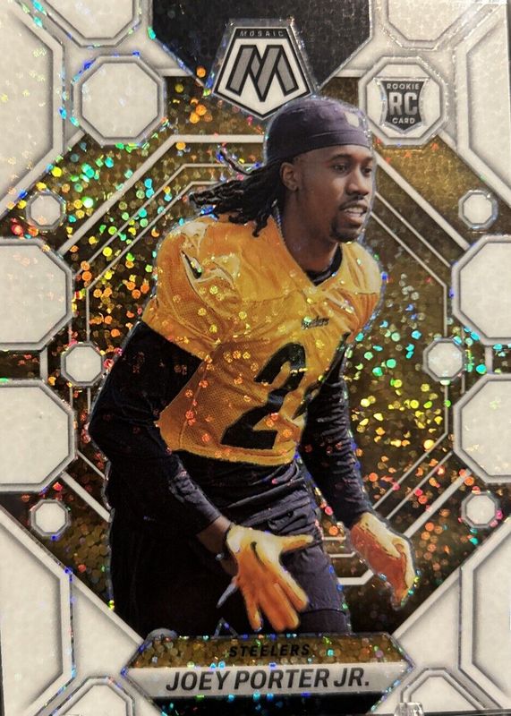Joey Porter Jr.'s Football cards are available in at least 11 sets. Joey Porter Jr.'s biggest 7-day price movers are 2023 Phoenix #157 Purple Seismic /125, 2023 Mosaic #335 White Sparkle /(SSP), and 2022 Bowman Chrome University #79 Prospect Auto - Green Refractor /99 (1st).