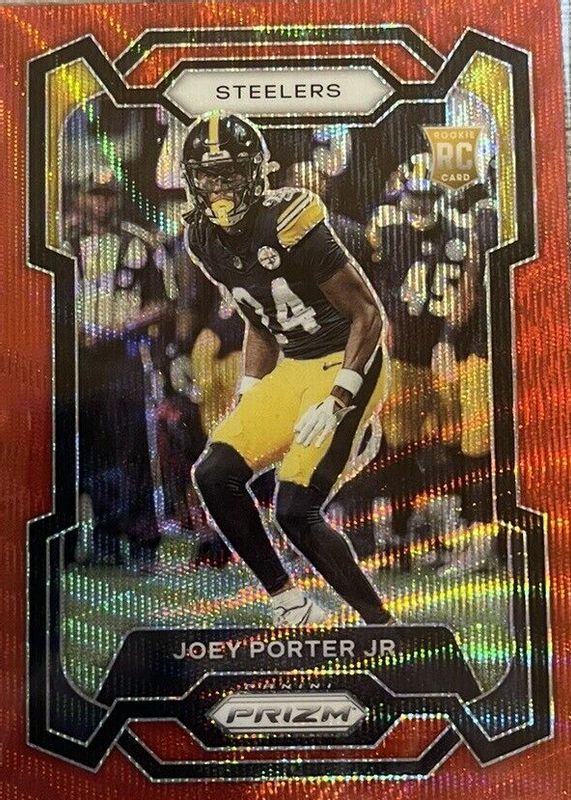 Joey Porter Jr.'s Football cards are available in at least 11 sets. Joey Porter Jr.'s biggest 7-day price movers are 2023 Prizm #386 Green Wave, 2023 Phoenix #157 Fire & Ice /50, and 2023 Phoenix #157 Orange Seismic /99.