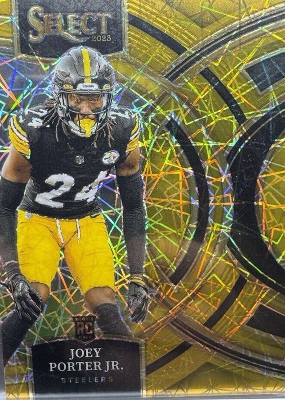 Joey Porter Jr.'s Football cards are available in at least 11 sets. Joey Porter Jr.'s biggest 7-day price movers are 2023 Select #179 Premier Level Gold /10, 2023 Phoenix #157 Fire & Ice /50, and 2023 Phoenix #157 Orange Seismic /99.