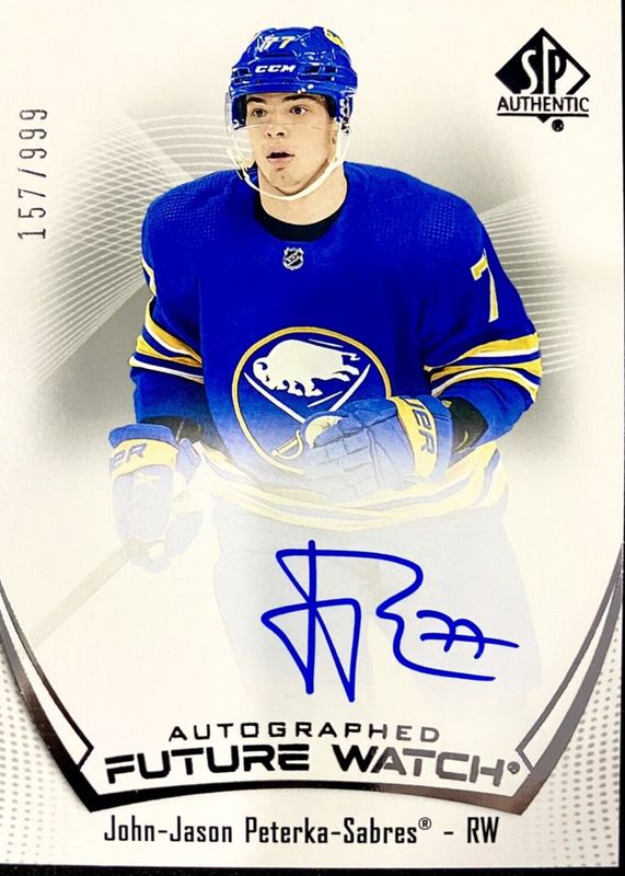 John-Jason Peterka's Hockey cards are available in at least 9 sets. John-Jason Peterka's biggest 7-day price movers are 2021 SP Authentic #152 Future Watch Auto /999, 2021 Upper Deck Extended Series #711 Young Guns Base, and 2021 Upper Deck Artifacts #RED184 Emerald /99.