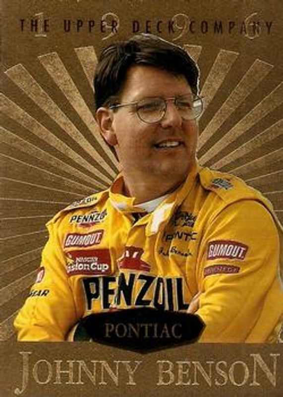 Johnny Benson's Racing cards are available in at least 4 sets. Johnny Benson's biggest 7-day price movers are 1996 Upper Deck Road to the Cup #R14 Predictors: Top 3 Exchange, 1996 Upper Deck Road to the Cup #H29 Autographs, and 1996 Upper Deck Road to the Cup #RC90b Base.