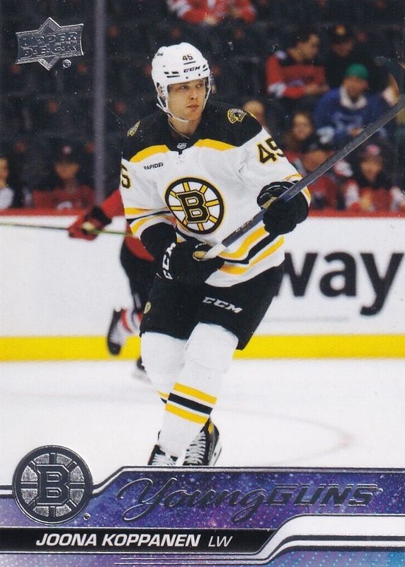 Joona Koppanen's Hockey cards are available in at least 14 sets. Joona Koppanen's biggest 7-day price movers are 2023 Upper Deck #203 Young Guns Base, 2023 SP Authentic #141 Future Watch Auto /999, and 2023 SP Authentic #141 Future Watch Auto - Inscriptions /50.
