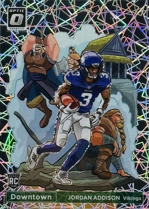 Jordan Addison's Football cards are available in at least 56 sets. Jordan Addison's biggest 7-day price movers are 2023 Prizm #368 Green, 2023 Prizm #368 Green Wave, and 2023 Optic #D-18 Downtown /(SSP).