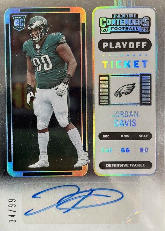 Jordan Davis' Football cards are available in at least 10 sets. Jordan Davis' biggest 7-day price movers are 2022 Prizm #371 Base, 2022 Contenders #148 Rookie Ticket Auto - Playoff Ticket /99, and 2022 Select #432 Field Level Cosmic /(SSP).