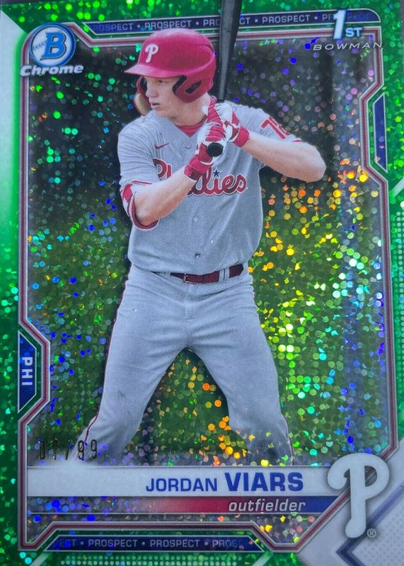 The biggest 30-day change Jordan Viars cards are 2021 Bowman Draft #BDC-132 Chrome - Green Sparkle Refractor /99 (1st), 2021 Bowman Draft Sapphire Edition #BDC-132 Chrome - Orange /25 (1st), and 2021 Bowman Draft Sapphire Edition #BDC-132 Chrome - Aqua /20 (1st).