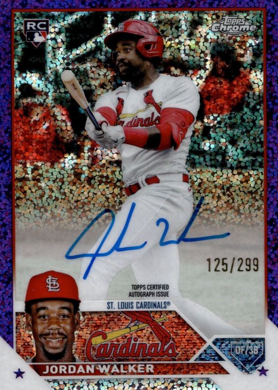Jordan Walker's Baseball cards are available in at least 66 sets. Jordan Walker's biggest 7-day price movers are 2023 Topps Chrome #RA-JWA Rookie Autographs - Purple Speckle Refractor /299, 2023 Topps Chrome Logofractor Edition #209 SP Variation, and 2023 Topps Chrome Update #LG-55 Let's Go - Red Refractor /5.