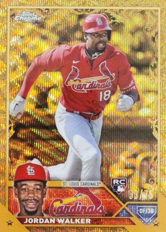 Jordan Walker's Baseball cards are available in at least 66 sets. Jordan Walker's biggest 7-day price movers are 2023 Topps #344 Base, 2023 Topps Gilded Collection #120 Wave Gold Etch Refractor /75, and 2023 Topps Chrome #209 Aqua Lava Refractor /199.