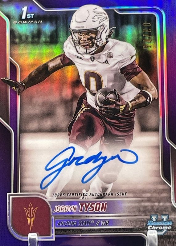 Jordyn Tyson's Football cards are available in at least 5 sets. Jordyn Tyson's biggest 7-day price movers are 2025 Bowman Chrome University #BCA-JTY Prospect Auto - Purple Refractor /75 (1st), 2025 Bowman Chrome University #31 Base (1st), and 2025 Bowman Chrome University #BCA-JTY Prospect Auto - Blue Mini-Diamond Refractor /150 (1st).