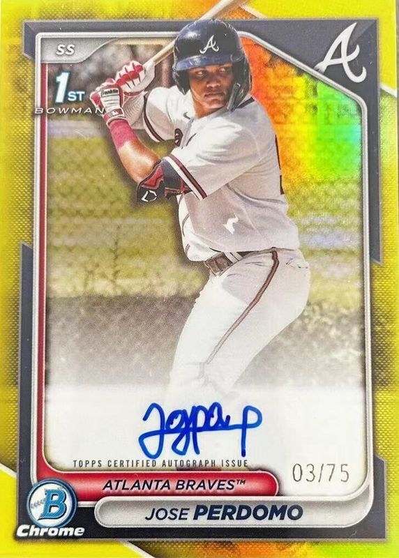 Jose Perdomo's Baseball cards are available in at least 12 sets. Jose Perdomo's biggest 7-day price movers are 2024 Bowman Chrome #CPA-JP Prospect Auto - Yellow Refractor /75 (1st), 2024 Bowman Chrome #CPA-JP Prospect Auto - Gold Shimmer Refractor /50 (1st), and 2024 Bowman Chrome #CPA-JP Prospect Auto - Blue Refractor /150 (1st).