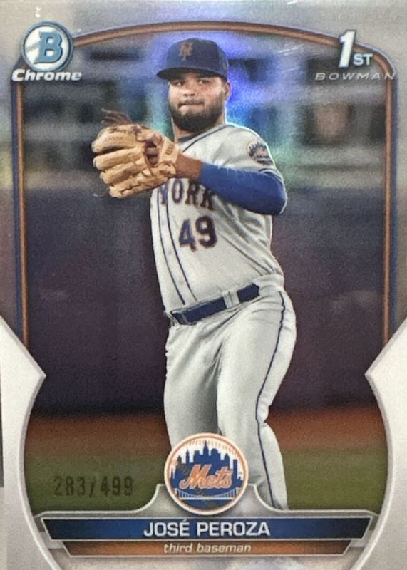 Jose Peroza's Baseball cards are available in at least 2 sets. Jose Peroza's biggest 7-day price movers are 2023 Bowman #BCP-149 Chrome Prospects - Refractor /499 (1st), 2023 Bowman #BCP-149 Chrome Prospects (1st), and 2023 Bowman 1st Edition #BPPF-149 Black Foil /10.