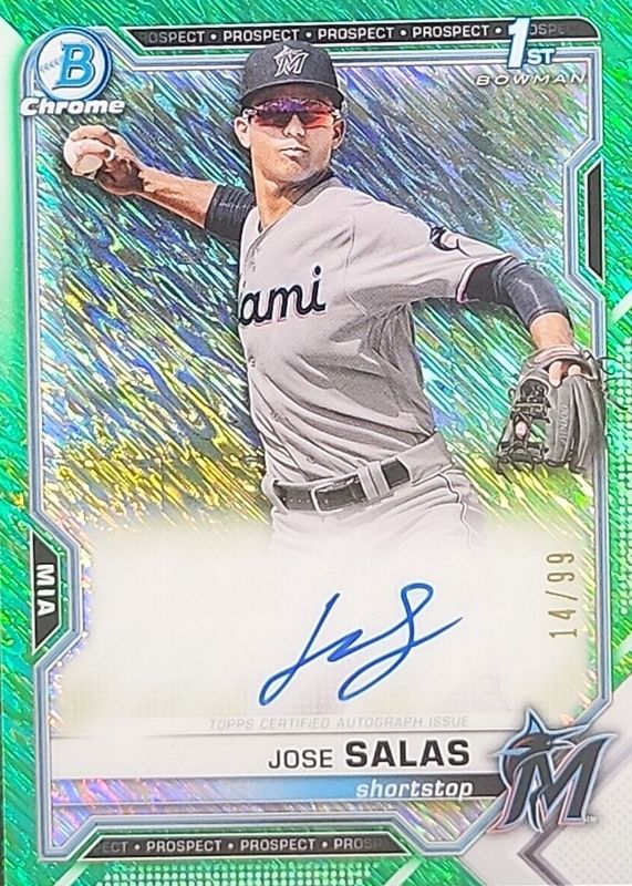 Jose Salas' Baseball cards are available in at least 6 sets. Jose Salas' biggest 7-day price movers are 2021 Bowman #CPA-JS Chrome Prospect Auto - Green Shimmer Refractor /99 (1st), 2024 Prizm #SS-JS Sensational Signatures - Blue /49, and 2024 Prizm #SS-JS Sensational Signatures - Blue Shimmer FOTL /8.