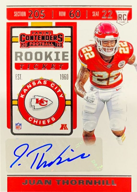 Juan Thornhill's Football cards are available in at least 7 sets. Juan Thornhill's biggest 7-day price movers are 2019 Contenders #155 Rookie Ticket Auto, 2019 Panini Instant #242 NFL Playoffs, and 2019 Panini Instant #35 NFL Playoffs - Green /10.