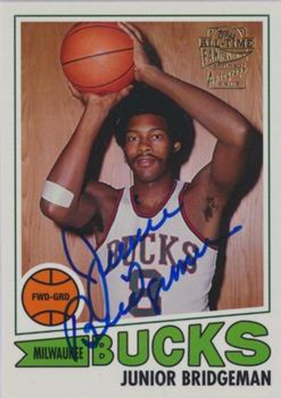 Junior Bridgeman's Basketball cards are available in at least 21 sets. Junior Bridgeman's biggest 7-day price movers are 2005 Topps 1952 Style #FFA-JBR All Time Fan Favorites Autographs, 2005 Topps 1952 Style #FFA-JBR All Time Fan Favorites Autographs Rainbow Foilboard /10, and 2002 Upper Deck Generations #156 Base /999.