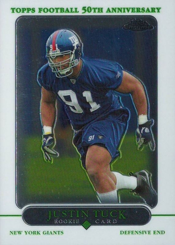 Justin Tuck's Football cards are available in at least 4 sets. Justin Tuck's biggest 7-day price movers are 2005 Topps Chrome #231 Base, 2005 Topps Chrome #231 Gold X-Fractor /399, and 2005 Topps Chrome #231 Black Refractor /100.