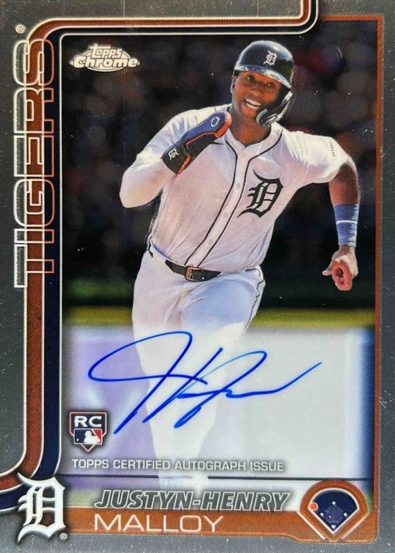 Justyn-Henry Malloy's Baseball cards are available in at least 18 sets. Justyn-Henry Malloy's biggest 7-day price movers are 2025 Topps Chrome #RR-13 Radiating Rookies /(SSP), 2025 Topps Chrome #RA-JM Rookie Autographs - Refractor /499, and 2025 Topps Chrome #RA-JM Rookie Autographs - Purple Speckle Refractor /299.