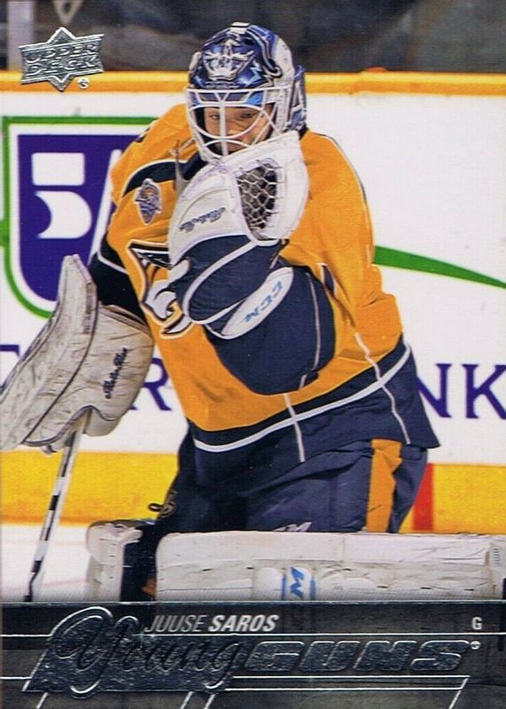 Juuse Saros' Hockey cards are available in at least 76 sets. Juuse Saros' biggest 7-day price movers are 2015 Upper Deck #464 Young Guns - Foil, 2022 Parkhurst #PK-11 Parkies, and 2022 Parkhurst #105 Bronze Border.