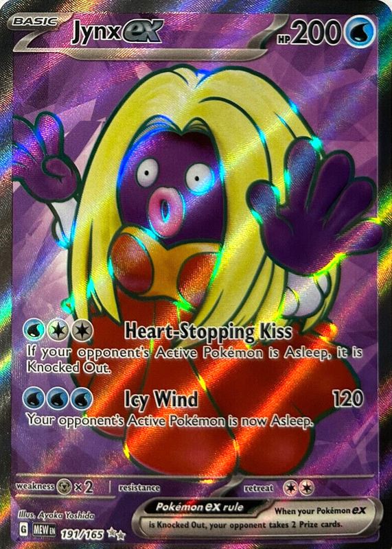 Jynx ex's Pokemon cards are available in at least 2 sets. Jynx ex's biggest 7-day price movers are 2023 Japanese Scarlet & Violet: 151 #124/165 Double Rare, 2023 Scarlet & Violet: 151 #124/165 Double Rare, and 2023 Japanese Scarlet & Violet: 151 #193/165 Super Rare.