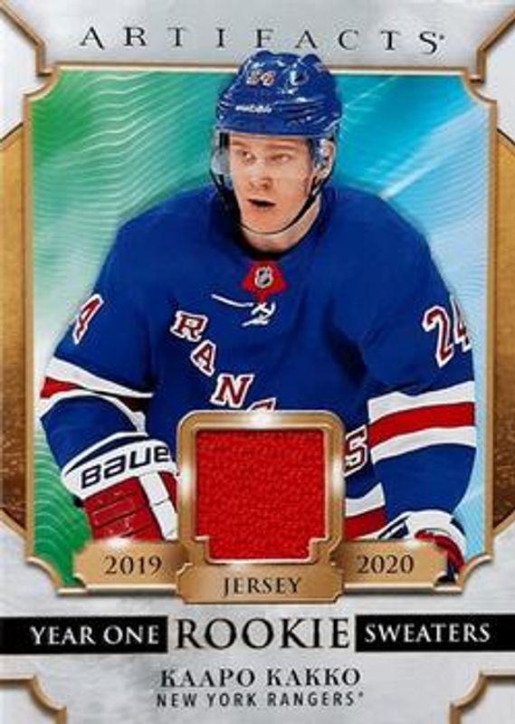 Kaapo Kakko's Hockey cards are available in at least 33 sets. Kaapo Kakko's biggest 7-day price movers are 2019 Upper Deck #499 Young Guns Base, 2020 Upper Deck Artifacts #RS-KK Year One Rookie Sweaters, and 2020 Upper Deck Artifacts #RS-KK Year One Rookie Sweaters Patch /25.