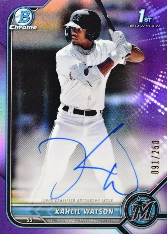 Kahlil Watson's Baseball cards are available in at least 7 sets. Kahlil Watson's biggest 7-day price movers are 2022 Bowman #BCP-3 Chrome Prospects (1st), 2022 Bowman #CPA-KW Chrome Prospect Auto - Purple Refractor /250 (1st), and 2022 Bowman #CPA-KW Chrome Prospect Auto (1st).