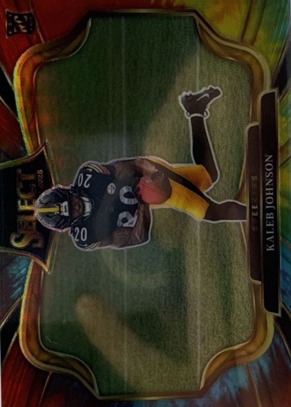 Kaleb Johnson's Football cards are available in at least 29 sets. Kaleb Johnson's biggest 7-day price movers are 2025 Certified #FBC-KJN Freshman Fabric Signatures - Mirror Pink /299, 2025 Select #52 Concourse Silver, and 2025 Origins #RJJ-KJN Rookie Jumbo Patch Autographs.